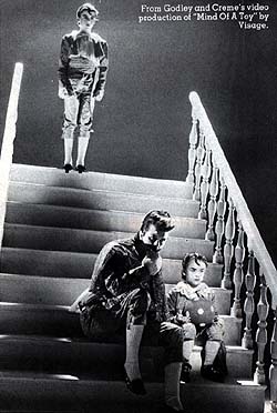 "Who can forget Steve Strange in 'The Damned Don't Cry'? This classic clip features Steve standing enigmatically on a thirties railway platform, a man haunted by his own achievements. We note Steve's enormous coat, which looks exactly like a military refrigerator-freezer. Smoke swirls around his ankles, but Steve dare not stir an inch, lest his coat bring him crashing to the ground. So there he stands- waiting, watching, slowly manufacturing ice cubes. Other points of interest in this tape include the birth of video surrealism- remember giant liquorice allsorts bounding down the stairs? chairs hanging from the ceiling? dolls-houses on fire? All this and more in 'Night Train', 'Fade To Grey', 'Mind Of A Toy', etc., etc."